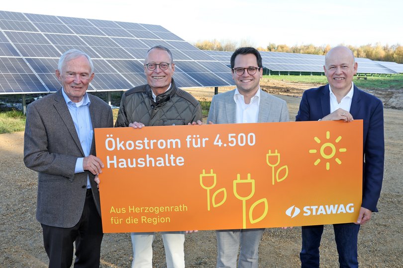 Solarstrom aus der Region, für die Region. Carl Meulenberg, Dr. Christian Becker (Vorstand der STAWAG), Dr. Benjamin Fadavian (Bürgermeister der Stadt Herzogenrath) und Frank Brösse (Geschäftsführer der STAWAG Energie GmbH) freuen sich über den neuen Solarpark. (v.l.n.r.)